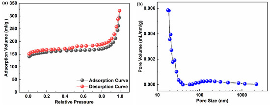 The pore-size distribution was discovered to be the most important factor in the characterizing of the porous carbon. The N2 adsorption/desorption isotherms were used to determine the porous carbon’s structure. As shown in Figure 7a, the N2 adsorption–desorption isotherm was type III, indicating the existence of a multi-level pore structure on the hydrophobic surface of the nano-carbon. There were porous structures, as evidenced by the rapid increase in adsorption–desorption isotherms in the high-pressure region. The desorption isotherm deviated significantly from the adsorption isotherm, thus indicating that there were various pore structures, which was confirmed by the staggered porous structure presented by the SEM. The specific surface area of nano-carbon was 617.79 m2/g. According to Figure 7b, the pore size of the nano-carbon was primarily distributed between 10 nm and 100 nm. The porous carbon with larger pore sizes and pore volume was found to be similar to the uneven structure of a lotus leaf, in accordance with classical lotus leaf theory.