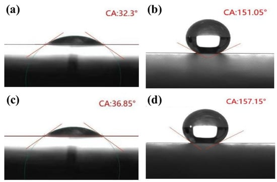 The hydrophobicity of the coating of the nano-carbon was evaluated by measuring the contact angle using a video-based optical-contact-angle meter. Figure 8a shows that the surface of the AAB was hydrophilic, with a water-contact angle of 32.3° before the coating. According to Figure 8b, the contact angle reached 151.05° after the nano-carbon coating. Figure 8c shows that the surface of the BB was hydrophilic, with a water-contact angle of 36.85° before the coating. According to Figure 8d, the contact angle reached 157.15° after the nano-carbon coating, and the hydrophobicity increased significantly. The droplets spread on the surface in the case in which no coating was applied. Theoretically, the air was stuck in those pores; thus, the rough nano-carbon coating could be viewed as a composite material composed of air and nano-carbon trapped in the pores, which can be modeled by Cassie-Baxter to describe [37]: