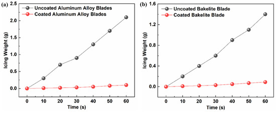Figure 9a,b present the change curve of the ice-coating weight on the coated and uncoated surfaces of AAB and BB in the static anti-icing experiment when the wind speed was 5 m/s and the test temperature was 0 °C. As clearly illustrated in Figure 9, the weight of the uncoated wind-turbine-blade model increased linearly, while the weight of the hydrophobic nano-carbon-coating-blade model also increased linearly; however, the increase was less than with the uncoated blade, and the growth trend of the BB was also less than that of the AAB. The maximum icing weights of the strong hydrophobic-nano-carbon-coating-based AAB and BB surfaces were almost 0.10 g and 0.09 g, respectively. The maximum icing weights of the uncoated blade were almost 2.10 g and 1.40 g, respectively. By comparing the ice types, the thickness of the ice on the surface of the blade coated with nano-carbon was lower.