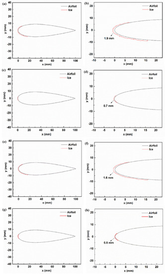 Through the ice-pattern images of the AAB and BB coating models after the icing and the highest results on the ice-proof wind-tunnel test, the ice thickness was measured at the point at which the front end of each of the four blade types was covered with the largest amount of ice. The overall icing images and the enlarged contrast images of local icing were obtained for the four types of blade. The main icing area of each blade was observed at the leading edge of the blade. According to Figure 10b,d, the uncoated AAB was 1.90 mm, and the nano-carbon-coated AAB was 0.70 mm. As indicated by Figure 10f,h, the uncoated BB was 1.60 mm, and the nano-carbon-coated BB was 0.50 mm. It was therefore revealed that the maximum icing thickness of the nano-carbon-coated BB was the lowest, which had a better anti-icing effect.