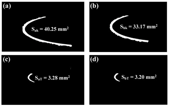 Through the ice-pattern images of the AAB and BB coating models, using the Monte Carlo algorithm, the icy areas of the blades were calculated based on a binary morphology. The method used to choose the image for solving these areas was to compare the image of the icy blade on a small square background with a known area as a reference object and convert the post-icing blade information into computer-recognizable image information. Because the digital images were made up of pixels, the area of the blade after icing was calculated based on the pixel scale and the area of the reference object. The area-calculation result is shown in Figure 11. Figure 11a,c show the AAB’s surface ice area. Figure 11b,d show the BB’s surface ice area.