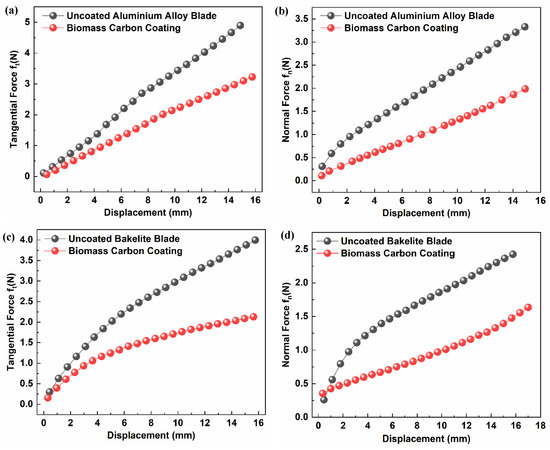 (a) Tangential-force tensile curve of AAB before and after coating. (b) Normal-force tensile curve of blade before and after AAB coating. (c) Tangential-force tensile curve of BB before and after coating. (d) Normal-force tensile curve of BB before and after coating.