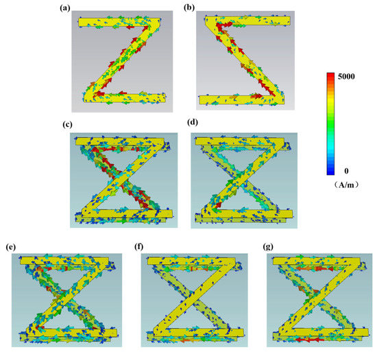 Surface current distributions of the proposed structures. (a) Single top Z-shaped meta-atom. (b) Bottom symmetric Z structure. (c–g) Integrated metasurface at 0.133, 0.148, 0.322, 0.458 and 0.546 THz, respectively.