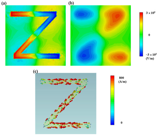 Electric field and surface current distribution of Z-type absorber at 0.525 THz. (a) Electric field distribution on the surface of Z-shaped meta-atom; (b) Electric field distribution on the surface of VO2 layer; (c) Current distribution on the surface of Z-shaped meta-atom.