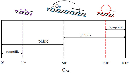 Surfaces wettability as defined by the receding contact angle for drops, where a surface is “superphilic” to the drop liquid if their receding contact angles is less than 30° and is “superphobic” to the drop liquid if their receding contact angles is greater than 150°.