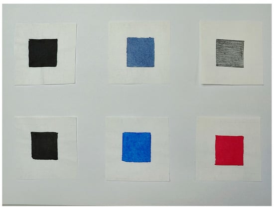 For a more realistic simulation of heritage paper, we chose the handmade Xuan paper made using the ancient method in Jingxian County, Anhui Province to be the experimental carrier. We cut the paper into 5 cm × 5 cm pieces. We used the six handwriting materials to coat it with color blocks in an area of 3 cm × 3 cm. We left it to dry at room temperature and observed the color difference and diffusion before and after reinforcement. As shown in Figure 1.