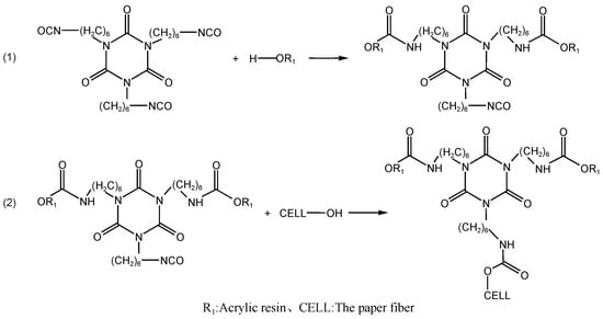 In order to ensure that the resulting acrylic polyurethane solution still has a sufficient amount of -NCO to combine with the -OH in the paper fiber, the HDI trimer and hydroxy acrylic acid were mixed in a butyl acetate solution in the ratio of -NCO: -OH = 1.5, with constant stirring until the solution was clear and without transparent precipitation (the concentrations in this test are all mass percent concentrations). The reaction process is shown in (1) in Figure 2. The reaction in (2) can be carried out by coating the reinforcement solution on the handwriting surface.