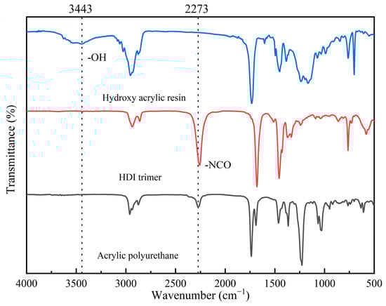 It can be seen that the -OH group of peak 3443 cm−1 in the spectrum of hydroxy acrylic acid has completely disappeared in the spectrum of acrylic polyurethane. This shows that the hydroxyl acrylic acid reacts fully with the HDI trimer, completing the chemical reaction shown in (1) in Figure 2. The -NCO group at peak 2273 cm−1 of the HDI trimer spectrum was still retained in the acrylic polyurethane spectrum, indicating that the synthesized acrylic polyurethane solution retained the ability to bond with paper and the prepared reinforcement solution was the same as expected.