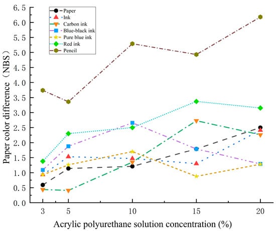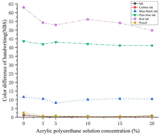 (1) Acid resistance: the ink and pencil did not diffuse in the experimental or matched groups. The ∆E* of the ink was relatively small and the experimental group data were smaller than the matched group, with a minimum color difference of 0.18 at 10%. The ∆E* of the pencil irregularly changes, showing a higher color difference than the matched group at 3% and 15% concentrations. Therefore, the acrylic polyurethane solution was unsatisfactory for pencil reinforcement in the acid resistance experiment. There was slight diffusion in the carbon ink matched group; none of the experimental groups showed diffusion, and the ∆E* was better than the matched group. In this experiment, blue-black ink showed a slight diffusion in the experimental and matched groups below 5% concentration of the reinforcing agent and no diffusion above 5%. The difference between the experimental and control groups was significant compared to the 15.19 (∆E*) in the matched group, showing a good reinforcement effect. The pure blue and red ink have serious diffusion in the matched and experimental groups. The ∆E* data show that the acrylic polyurethane solution still has a reinforcement effect on these two handwriting materials, and the reinforcement effect on red ink is more prominent (as shown in Table 3 and Figure 6).