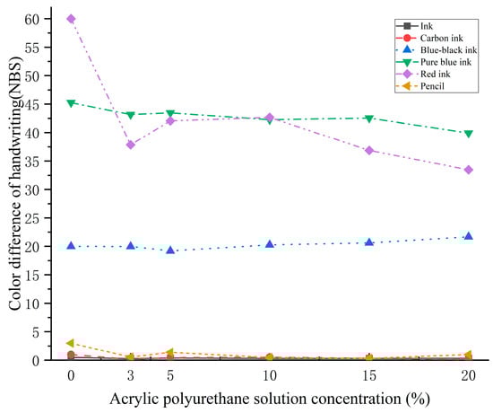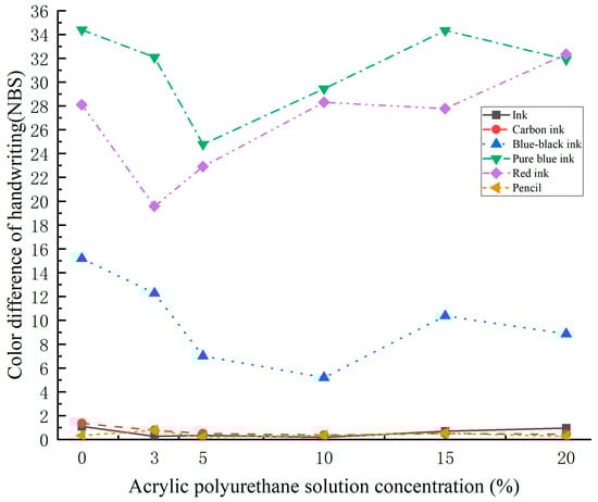 (4) Dry heat aging resistance: the experiment was recorded for 36 h and 72 h of dry heat aging data; the data on the experimental group are still better than those of the matched group, which can be seen in Table 6. The ink, carbon ink, and red ink were well reinforced and the ∆E* did not fluctuate significantly with increasing heat aging time, which also indicates that the ∆E* of the reinforcing agent did not change significantly with time. The ∆E* of black ink, pure blue ink, and pencil is relatively large between 36 h and 72 h. Except for ink and pencil, other handwriting materials show the trend of ∆E* decreasing proportionally to the increase in concentration.