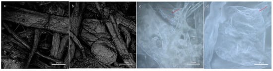 A 3D measurement laser microscope characterizes the internal morphology of the paper. Figure 9a,b are laser images of paper: (a) is the surface of unreinforced paper fiber, which shows that there are many fine chapped lines on the fiber surface; (b) is the surface of reinforced paper fiber, and it can be observed that the fiber surface becomes smooth and has no chapped lines, which shows that the fiber surface is covered with a layer of acrylic polyurethane film. In addition, the original loose mesh structure is still maintained among the fibers, and the inherent texture of the paper can be preserved; (c) and (d) are color images of the 3D measurement laser microscope; (c) shows that colored resin cross-linked parts can be observed between fibers; and (d) found more oversized resin embedded between fibers. These increase the strength of paper fibers.