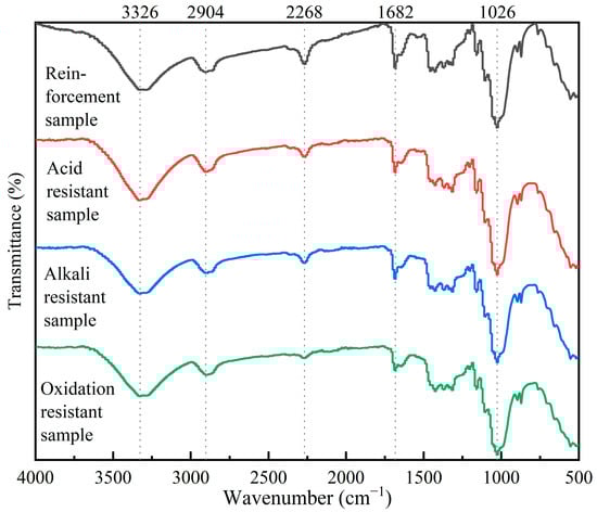 In order to further explore the aging resistance of acrylic polyurethane, infrared spectroscopy analysis was conducted on the paper samples after durability experiments. Use the reinforced paper samples as the matched group. In Figure 11, 3326 cm−1 is the characteristic peak of the paper -OH group and 2904 cm−1 is the characteristic peak of cellulose methyl and methylene. The characteristic peak of the unreacted -NCO group in acrylic polyurethane is 2268 cm−1. The characteristic peak of carbamate C=O produced by the reaction of reinforcing agent and paper hydroxyl is 1682 cm−1. The characteristic peak of C-N in acrylic polyurethane is 1026 cm−1. It can be seen that the characteristic peaks of -NCO, C=O, and C-N that appeared in the matched group remained after the durability experiment, and the height of the characteristic peaks changed little, indicating that acrylic polyurethane has good durability.