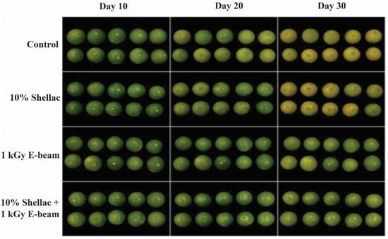 Effect of shellac coating with E-beam irradiation on lime. Reprinted from [83], copyright 2021, with permission from Elsevier.