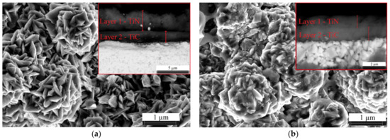 Generally, TiN and TiC coatings have been used on cutting tools for over three decades and continue to be important components of current tools. Titanium nitride and titanium carbide (TiN, TiC) are well-known for their strong adhesion, high melting point, chemical stability, lack of phase change, high hardness, and wear resistance. The use of TiN and TiC improves the thermal stability, oxidation behavior, and abrasive wear of the coating [8,9]. Consequently, applying TiN and TiC coatings on cutting tool materials increases features such as hot hardness, thermal shock, oxidation, chemical stability, toughness, and tribological characteristics [10].
