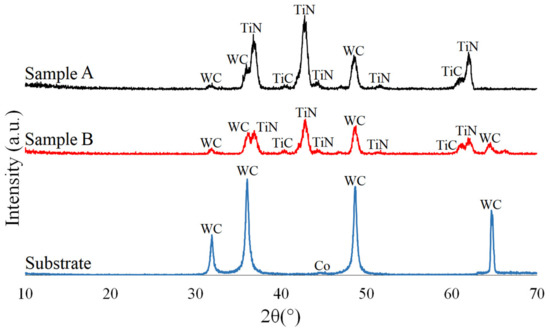 Figure 2 illustrates the phase composition of the substrate and the coatings formed on it. Characteristic reflections of tungsten carbide and cobalt can be seen on the substrate. In the case of Sample B, the reflections of the deposited coating also appear, but with a much lower intensity than in the case of Sample A. As was also visible in the scanning electron microscope images, the TiN coating is present in a better crystallized form on the surface of Sample A, with characteristic reflections of this being much more intense.