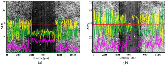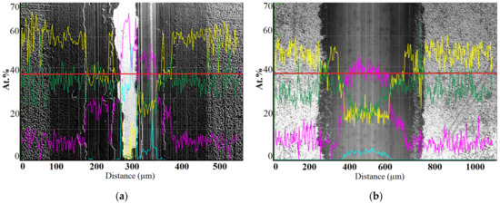 The current study investigated the tribological behavior of CVD-coated samples using both steel and zirconia balls, with the microstructural and compositional analysis conducted using EDS. Figure 5 shows the EDS line scan results of the coated samples after a tribological test at a sliding distance of 500 m, where the y-axis indicates the atomic percentage distribution and the x-axis shows the distance (the line analysis was performed along the red line shown in Figure 5 and Figure 6, using backscattered electron imaging). As previously shown, during tests with a steel counterpart, the steel adhered to the coating surface, so before the EDS tests it was removed with an 18 vol.% hydrochloric acid solution, and before the test, each sample was washed in an ultrasonic bath with ethanol.