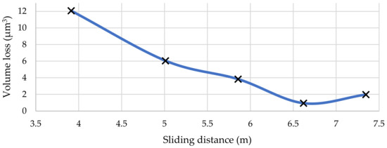 As the TiC coating was not removed by the 500 m tribological test in the case of sample A, a 1550 m test was also conducted with a zirconium static counterpart. The changes in volume loss values measured after the 50 m, 150 m, 350 m, 750 m, and 1550 m wear tests are illustrated in Figure 7. The y-axis on the graph shows the natural logarithm of the volume loss, while the x-axis shows the natural logarithm of the sliding distance. It can be seen from the results that a significant amount of zirconium was detached from the contact surface of the ball after the 50 m wear test. This phenomenon can be attributed to the TiN layer containing numerous small crystals with sharp edges in this case. The wear amount sharply decreases up to 750 m, and then slightly increases between 750 and 1550 m. This phenomenon can be attributed to particles that detached from the contact surface of the static zirconia counterpart over a distance 800 m between the last two measurement points, which exerted an abrasive effect. As a result of these particles detaching, there was a slight increase in volume loss. In this case, the partial detachment of the TiC coating may have already started, and the abrasive wear processes of the particles present on the contact surface further wore down the zirconium ball.