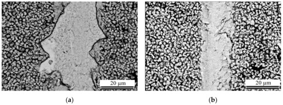 In the scratch test, a non-standard method was used to investigate the adhesion of the coatings. During the measurement, the normal compressive force was kept constant at 5 N, and the total scratch length was 10 mm. The evaluation of the results was based on SEM micrographs (Figure 9).