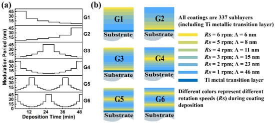 Figure 1 shows the experimental details of specimens and the schematic diagrams of the TiN/TiSiN gradient multilayer coatings. The modulation period (Λ) in the G1~G6 gradient multilayer coatings varied with the increasing deposition time (Figure 1a). In Figure 1b, the different colors represent different layers, showing different rotation speeds within 1 to 6 rpm, and the modulation periods of the TiN/TiSiN bilayers with 6 to 46 nm per rotation, respectively. All the G1~G6 coatings had a total of 168 TiN/TiSiN bilayers, i.e., 6, 12, and 24 gradient layers for G1–G2, G3–G4, and G5–G6 multilayers, respectively. The ideal thickness of all the coatings was 2.156 µm, including a Ti transition layer of 100 nm.