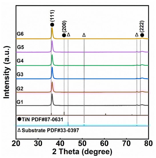 XRD patterns of TiN/TiSiN coatings with different gradient multilayer structures of G1~G6.