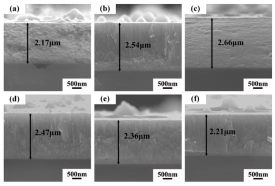 The cross-sectional micrographs of TiN/TiSiN gradient multilayer coatings are shown in Figure 4. The incorporation of Si inhibited the grain growth and induced grain re-nucleation [47], resulting in a dense and compact structure for all coatings. The thickness in this study was between 2.17 and 2.66 μm, indicating a deposition rate of 43.3 to 53.2 nm/min.