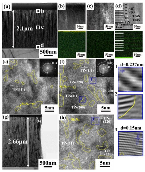 (a) Cross-sectional TEM image of TiN/TiSiN coating with the gradient multilayer structure of G1. (b–d) Local enlarged images and mapping distribution of Si corresponding to squares b, c, and d in (a). (e,f) HRTEM images of the TiN layer and the TiSiN layer of the G1 structural coating. Here, 1 and 2 are inverse fast Fourier transformation (IFFT) images corresponding to squares 1 and 2 in (f). (g) Cross-sectional TEM image of TiN/TiSiN coatings with the gradient multilayer structure of G3. (h) HRTEM image of the TiSiN layer near the surface. Here, 3 is the IFFT image corresponding to square 3 in (h).