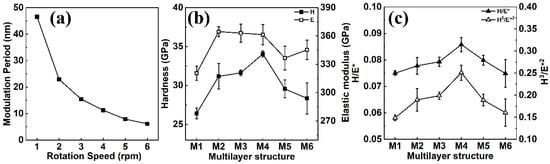 Modulation period of bilayer (a), nano-hardness and elastic modulus (b), and H/E* and H3/E*2 ratios (c) of TiN/TiSiN coatings prepared at the fixed rotation speed.