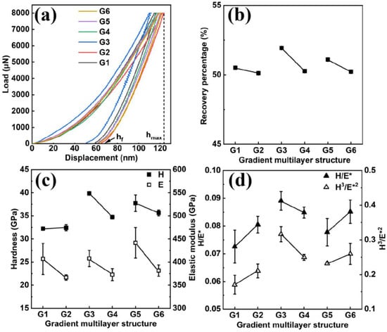 (a) Load–displacement curves for different structures, (b) corresponding to recovery percentage, (c) hardness and elastic modulus, and (d) H/E* and H3/E*2 ratios of gradient multilayer coatings.