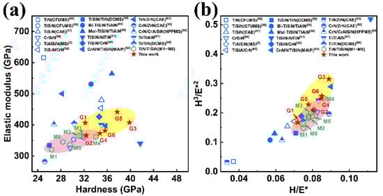 (a) The elastic modulus with respect to hardness and (b) H3/E*2 ratios with respect to H/E* for the TiN/TiSiN gradient multilayer coatings, in comparison to the coatings containing Si in other references measured by nano-indentation [3,24,60,61,62,63,64,65,66,67,68,69,70,71,72].