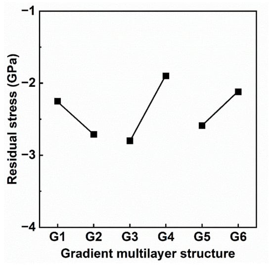 XRD residual stress measurements were used to evaluate the macro-stress in the coatings, as shown in Figure 9. The compressive residual stresses of gradient multilayer coatings were −2.25, −2.71, −2.8, −1.9, −2.59, and −2.12 GPa, which are reduced in comparison to the monolayer TiSiN coating (about −7.8 GPa) [73], confirming that the construction of multilayer structures can effectively reduce the stresses [74]. Increasing the residual compressive stress can prevent the propagation of cracks and improve the resistance to adhesive wear of the coating, but excessive residual stress may cause the coating to separate from the substrate. The residual stress had a similar trend with the hardness, as shown in Figure 7c. It was reported that an appropriate compressive residual stress can decrease the friction coefficient and the wear rate, as well as reduce the adhesion aggregation [75]. Bobzin et al. reported that the compressive residual stress of the coating between −2 and −3 GPa may have the highest resistance to crack formation and the best cutting performance [76].
