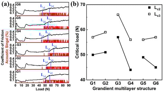 Figure 10 shows the coefficient of friction (COF) and the acoustic signal as a function of the scratching load. According to the change of the COF to determine the critical load of the coatings, Lc2 is the critical load of the cohesive fracture of internal coatings, while Lc3 is the spalling failure of the coatings [37]. With the increase of the load, the coatings showed some cracks and flakes slightly inside the scratch, and the width of the scratch gradually increased, accompanied by micro-spalling around the scratch, and the critical load is Lc2. Then, in the next stage, as the load increased, the micro-crack coalesced under a large shear stress, leading to the fracture of the coatings [64]. The Lc2 values of different structural TiN/TiSiN coatings were between 44 and 57 N, and the Lc3 values were between 56 and 66 N. The Lc2 value was 57 N and the Lc3 value was 66 N for the G3 structural coating, indicating a great improvement in adhesive strength. The G3 structural coating had the highest hardness and the largest residual stress, which improved the homogeneity of the coatings and led to stronger bonding [37].