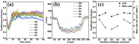The evolution of the coefficient of friction (COF) along with the sliding distance for different multilayers at room temperature (RT) are depicted in Figure 12a. The COF increased in the initial running-in stage, and then reached a plateau during the steady-state friction period, and finally decreased after the friction time exceeded 45 min. Taking the G3 structural coating as an example, during the running-in stage, solid particles such as droplets on the coating surface first contacted with the Al2O3 counterpart, resulting in a sudden increase of the coefficient. Then, the solid particles were worn flat, the contact area became larger, and the COF decreased, entering the steady-state stage. When the friction time exceeded 45 min, along with the deepening of friction, the surface layer was removed, the particles falling off the coating were reduced, and the abrasive wear and the COF decreased. The COF was 0.5 to 0.6 for all gradient multilayer coatings, and the wear depth varied from 500 to 800 nm with the wear rate of 4.4 × 10−3~6.1 × 10−3 mm3 (Nm)−1, as shown in Figure 12b,c. The presence of a thin friction layer comprising a lubricant phase such as titanium oxide may have contributed to the lower COF of the multilayer coatings compared to the TiSiN coating (the COF range of 0.7 to 1.1) [34,47,77]. The G3 structural coating had the minimum COF and the minimum wear rate of 4.4 × 10−3 mm3(Nm)−1. Generally, coatings with a higher hardness have a smaller COF. Therefore, the G3 structural coating, which had the highest H, showed the lowest COF. The H3/E*2 ratio is correlated with the resistance to plastic deformation, which reveals the relative wear resistance [49], so the G3 structural coating had the smallest wear rate compared to the others, and had the highest H/E* and H3/E*2.