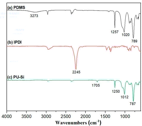 The Infrared spectroscopy (IR) were able to verify the structure of the prepolymer [42,43,44]. As shown in Figure 1a, 3273 cm-1 was the characteristic absorption peak of the hydroxyl groups in PDMS, 1020 cm−1 was the stretching vibration absorption of Si–O–Si, 1257 cm-1 was the symmetric bending absorption peak of the methyl group in Si–CH3, and 789 cm−1 was the stretching vibration absorption peak of Si–C. As shown in Figure 1b, IPDI shows a characteristic absorption peak of –NCO at 2245 cm-1. In the IR spectra of the prepolymer (Figure 1c), a new C=O(–NHCOO–) stretching vibration absorption peak at 1705 cm-1, a Si–O–Si stretching vibration absorption peak at 1012 cm-1, a Si–C symmetric bending absorption peak at 1250 cm-1, and a Si-C stretching vibration peak at 787 cm-1 are apparent. Meanwhile, the absorption peak of active hydrogen at 3273 cm-1 became weaker, and the characteristic absorption peak of -NCO at 2245 cm-l disappeared. These data indicate that PDMS completely reacted with IPDI, and the polyurethane was successfully embedded in the molecular chain of PDMS.