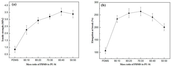Effect of mass ratio of PDMS to IPDI on mechanical properties of samples. (a) Tensile strength of samples; (b) Elongation at the break of samples.