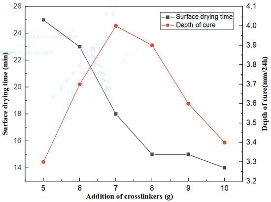 As Table S2 and Figure 3 show, the higher the amount of crosslinker, the shorter the drying time of the silicone rubber. This is because increasing the crosslinking agent increases the chance of the crosslinking agent combining with water vapor. When the amount of crosslinker exceeds 8 g, the effect of increasing the crosslinker on the drying time becomes less and less. With the increase of the crosslinking agent content, the deep curing rate of vulcanized rubber shows a trend of first increasing and then decreasing. In the case of a moderate increase in the crosslinking agent, the chance of the intermolecular condensation of the crosslinking agent occurring correspondingly increases, with a positive effect on deep curing. With the further excess of the crosslinking agent content, the increase of the crosslinking density has a barrier effect on water vapor, such that the moisture does not easily diffuse into the interior of the rubber, resulting in slowing down the vulcanization speed. Therefore, according to the experimental results, we chose the amount of crosslinking agent to be 7 g.