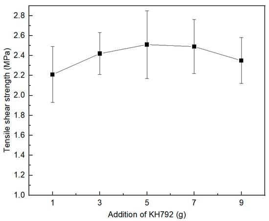 The silane coupling agent is a class of silicone compound containing two different chemical functional groups in the molecule, which improves the adhesive performance of the material surface by improving the wettability of the adhesive and fully bonding with the bonded material. In this paper, the amine coupling agent KH792 was chosen as a tackifier. The experimental results are detailed in Figure 4 and Table S3. When KH792 was added at the amount of 1–9 g, the obtained silicone rubber had good adhesion to the experimental substrates. When the amount of coupling agent exceeded a certain limit, it did not contribute to the bonding performance of the substrate. The adhesion properties did not continue to improve with the addition of the coupling agent, probably because the coupling agent molecules migrated to the bonding interface and formed only a single molecular deposit layer on the surface. The best adhesion was obtained at the additional amount of 5 g (Figure S3).