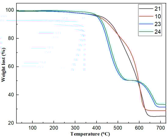 Figure 5 and S4 show the thermal weight loss graphs of silicone rubber samples 10, 21, 23, and 24. The decomposition interval of silicone rubber was divided into two intervals: the first one (400–500 °C) is for small and medium molecules of silicone rubber, and the second one (500–700 °C) is for large molecules and powders.
