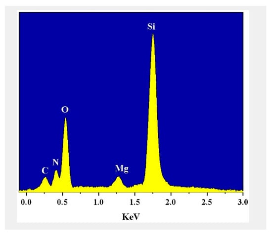 Table 3 shows that both the tensile strength and elongation at the break of the silicone rubber decreased with increasing magnesium hydroxide. The changes in mechanical properties of the four samples can also be verified in the scanning electron micrographs. Figure 6 shows that the surface of the four sample films became more and more uneven with the increase of magnesium hydroxide content; the particles were dispersed more and more unevenly, and some of the particles in the films showed agglomeration. The composition of sample 23 was examined by Energy dispersive spectrum (EDS). Table S4 and Figure 7 show the atomic percentages of the Si, N, Mg, O, and C elements, with higher content of Si and O atoms and 7.17% of Mg atoms. The results of the flame retardation experiments and thermogravimetric analysis tests showed that the added Mg(OH)2 improved the fire performance of the insulating coating.
