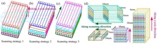 Compressive specimens design. (a) Scanning strategy 1; (b) Scanning strategy 2; (c) Scanning strategy 3; (d) Size of specimens.