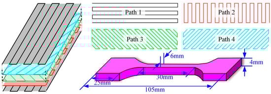 According to the previous experimental studies, the process parameters selected for preparing specimens based on different scanning strategies in this study are laser power 450 W, scanning speed 0.55 mm s–1, powder feeding rate 8.26 g min–1, shielding gas flow rate 12 L min–1, powder feeding gas flow rate 8 L min–1, distance between bottom plane of nozzle and substrate surface 14–16 mm, and defocusing rate 0 mm. Distance between the centers of the adjacent clad tracks was 0.9 mm during transverse overlapping and the distance between the clad paths of the adjacent cladding layer was 0.35 mm during longitudinal overlap. The off-line software RobotArt (PQArt(×86)) was used to design the trajectories of different scanning strategies. Based on the horizontal and vertical overlapping distances obtained from previous experiments, the trajectories were designed and optimized according to the designed cuboid size (35 mm × 25 mm × 15 mm) as shown in Figure 1a–c, respectively. Preparation of the tensile pattern is presented in Figure 1c, and the cuboid size is 115 mm × 30 mm × 12 mm, as shown in Figure 2. The total length of the tensile specimen is 105 mm, the gauge is 30 mm in size with the section size 4 × 6 mm2, the length of parallel segment for clamping is 25 mm, and the width is 20 mm. Furthermore, the scanning strategy 1 (Figure 1a) has the same trajectory in each layer, and the scanning strategy is consistent with the path 1 shown in Figure 2. For scanning strategy 2 (Figure 1b), the scanning directions of the adjacent two layers are perpendicular to each other, and the scanning strategy indicates that the paths 1 and 2 are alternate to each other as presented in Figure 2. Scanning strategy 3 (Figure 1c) involves paths 1, 2, 3 and 4 as presented in Figure 2. Path 1 is perpendicular to path 2, 3 is perpendicular to 4, and the angle between paths 2 and 3 is 45°.