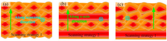 Figure 3 displays that the distribution of the laser energy density in laser cladding process is Gauss distribution [29]. Figure 3a exhibits the temperature distribution of scanning strategy 1’s (Figure 1a) cross-section. Clearly, the temperature in the overlap zone is lower than that in the center of the molten pool when cladding is carried out with a single scanning strategy. The remelting area of the overlap zone is the smallest, which is prone to generate cracks and pores. The difference of temperature gradient in the overlapping zone and clad track central area is large, and thus significant microstructure heterogeneity will be observed. Figure 3b shows the temperature distribution of scanning strategy 2’s (Figure 1b) cross-section. Compared to that in strategy 1, temperature inhomogeneity in strategy 2 gets significantly improved, but it still shows the main area for the appearance of the pores and cracks in the overlap area of adjacent two-layer clad tracks. Figure 3c exhibits the temperature distribution of scanning strategy 3’s (Figure 1c) cross-section. More remelting happens and the temperature grade in overlap area is low. During cladding, the overlap area within the layer and the overlap area between the layers are often the areas where defects occur [27]. The areas where defects occur in each layer are concentrated in the overlap area, thus the direction of each layer gets changed to change the direction of defect generation, thereby weakening the defect [30].