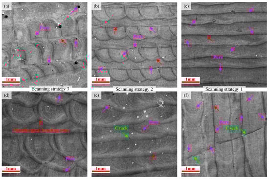 Cross-section morphology of specimens under different scanning strategies. Along the z-axis direction: (a) Scanning strategy 3; (b) Scanning strategy 2; (c) Scanning strategy 1. Parallel to the scanning direction: (d) Scanning strategy 3; (e) Scanning strategy 2; (f) Scanning strategy 1.