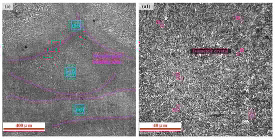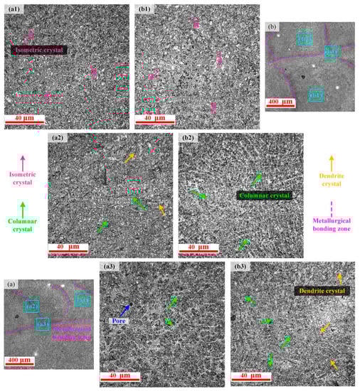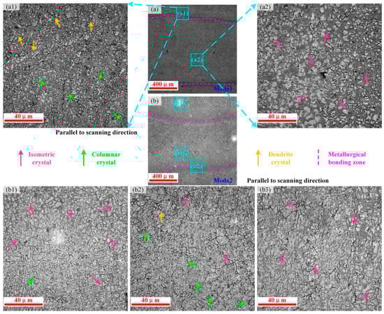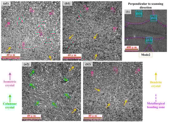 Figure 8 shows the microstructures of scanning strategy 1 and scanning strategy 2 in cross-sections parallel to the scanning direction. The microstructures in the molten pool consist of isometric crystals, and the uniformity of the structure in scanning strategy 2 is higher than that in scanning strategy 1. Regardless of the scanning strategy, columnar dendrite and dendrite crystals are mainly formed in metallurgical bonding zone and in its vicinity area, as shown in Figure 8(a1,b2).