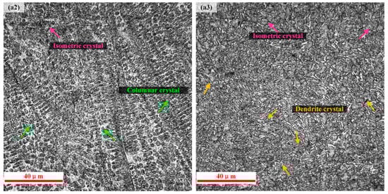 Figure 5 shows the microstructures of different areas in the cross-section along the z-axis direction of scanning strategy 3. According to the microstructure of the overlapping area for which the adjacent two-layer paths are distinguished along the direction of length and width of cladding the rectangular block (as shown in Figure 5a), and the microstructure of the overlapping area for which the adjacent two-layer paths are perpendicular to each other and have an angle of 45° with the rectangular edge (as shown in Figure 5b), the microstructure of the cross-section is found to be fine and uniform. Figure 5(a1,b1) exhibits magnified images of the microstructure of the molten pool. During the cladding process, the internal temperature of the molten pool is the highest, the temperature gradient is small, the heat dissipation is slow, and the grain growth time is long; thus, the main crystal is isometric in nature. Figure 5(a2) shows an enlarged image of the microstructure of the overlapping zone of the two clad tracks. With the increase of the temperature gradient at the overlap, columnar dendrite crystals appear. Remelting leads to continuous growth of columnar dendrite crystals, which eventually become dendrites. Friction, shear, and collision between dendrites break them up into fine dendrites, and thus in this zone, dendrite dominates. Figure 5(b2) exhibits the enlarged image of microstructure of the zone which is around the overlapping zone. During cladding, the temperature in this area is low, the temperature gradient is large, the grain growth time is short after nucleation, and the remelting effect is poor; thus, the secondary growth of grain is not obvious. Therefore, this zone mainly consists of columnar dendrite crystals. Figure 5(a3,b3) shows enlarged images of the microstructure of the overlapping zone between the two layers. This region has a large temperature gradient; therefore, the microstructure mainly consists of columnar dendrite and isometric crystals. There is little difference in the grain size of the entire section, and it has a high homogeneity.