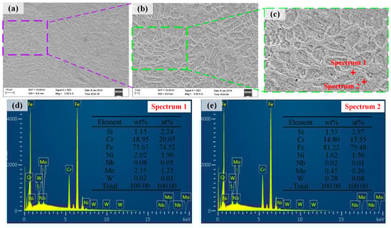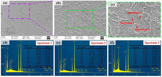 The SEM image and corresponding EDS spectrum of the specimen fabricated via scanning strategy 3 are shown in Figure 9 and Figure 10. The EDS results reveal that the grain boundary is rich in Cr, Ni, Mo, and Nb (as shown in Figure 9d), whereas the grain interior is rich in Si, Fe, and W (as shown in Figure 9e). The grain boundary consists of lamellar phase, as shown in Figure 9c. Figure 10 shows the microstructure of the metallurgical bonding zone of overlapping regions. The grain interior does not contain Nb and W, and the content of elements Fe and Cr are basically the same, as shown in Figure 9e and Figure 10e. Figure 10d demonstrates that the entire rectangular area of spectrum 1 is dominated by Fe, and a significant amount of Cr is also observed. It can be concluded that the structure along the grain boundary is some displacement solid solution about Fe-Cr/Si/Ni/Mo. Figure 10f exhibits the existence of significant amounts of Fe, Cr, and Mo. The Mo enriched in the metallurgical bonding zone formed the solid solution Fe-Cr/Mo/Si/Ni/Nb/W. High Cr content in the laser cladding layer reduced the tenacity of the Fe-based alloy. The solid solution strengthening effect resulted in the lattice distortion of ferrite and then improved the hardness and strength of the coatings.