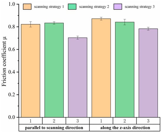 Scanning strategy 3 shows the smallest friction coefficient in both ‘horizontal direction’ and ‘vertical direction’ compared to scanning strategy 1 and scanning strategy 2. In scanning strategy 3, the uniformity of structures in the two directions is high, as shown in Figure 5 and Figure 6. This result benefits from the uniform distribution of remelting zone, a small difference of temperature gradient, and uniform distribution of temperature field during the cladding process. In the cladding process, there is no change in the powder composition, and the laser power, scanning speed, and powder feeding rate, etc., remain the same; that is, the energy input is the same. Different scanning strategies can change the temperature input mode, thus affecting the temperature distribution, further controlling the microstructure, and eventually affecting the wear resistance of the clad layer. The dense microstructure leads to an increase in the number of boundaries that need to be destroyed in the wear process, and the wear resistance increases.