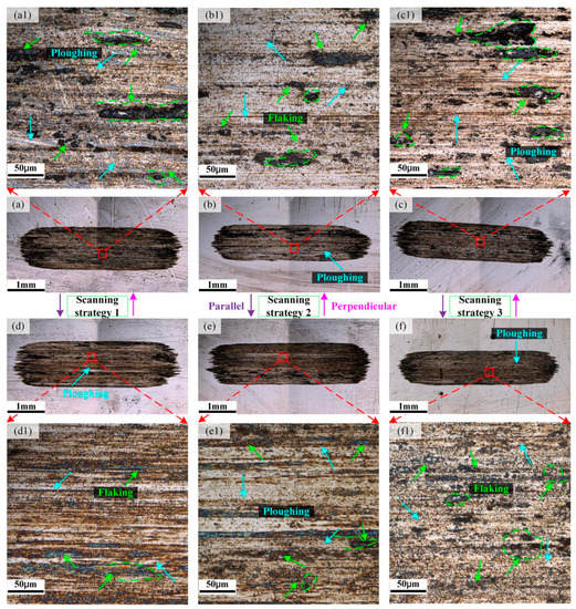 Wear morphology. Perpendicular to the scanning direction: (a,a1) scanning strategy 1; (b,b1) scanning strategy 2; (c,c1) scanning strategy 3. Parallel to the scanning direction: (d,d1) scanning strategy 1; (e,e1) scanning strategy 2; (f,f1) scanning strategy 3.