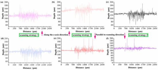Sectional profile of scratch under different scanning strategies. Along the z-axis direction: (a) scanning strategy 1; (b) scanning strategy 2; (c) scanning strategy 3; Parallel to scanning direction: (d) scanning strategy 1; (e) scanning strategy 2; (f) scanning strategy 3.