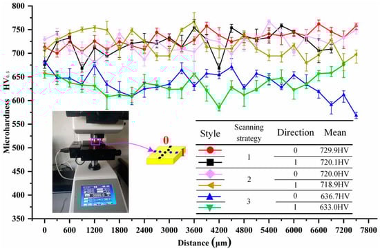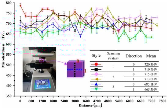 Figure 14 and Figure 15 show the microhardness profiles along the z-axis direction and scanning direction, respectively. The values of average microhardness of different scanning strategies are between 633.0 and 729.9 HV0.5. Different scanning strategies have an obvious effect on the microhardness value of the cladding layer. The microhardness of scanning strategies 1, 2, and 3 decreased in turn. The microhardness of scanning strategy 3 was the minimum, with the value of about 633.0 HV0.5 (the specimen was parallel to the scanning direction), and the microhardness of scanning strategy 1 was the maximum, the value being about 729.9 HV0.5 (the specimen was parallel to the scanning direction).