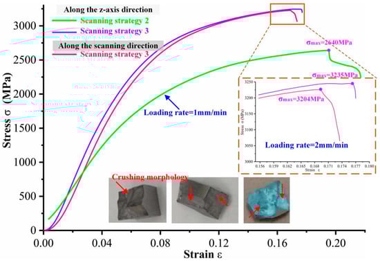 The obvious tension–compression asymmetry in laser-formed parts was observed in Figure 16 and Figure 18, which agrees with what was previously reported in the literature [31]. The difference in loading direction of tensile and compression tests resulted in the different work hardening [32]. During the tension process, the alloy exhibited a limited work-hardening behavior and failed at a strain of 0.141. The cracking of grain boundaries of the overlap zones caused the drop in the flow stress [32,33]. With the crack’s extension, the specimen is a failure. However, during the compression test, the alloy showed a more substantial and sustained work-hardening behavior than the tension specimen and failed at a strain of 0.174 (scanning strategies 3) and 0.217 (scanning strategies 2). In this paper, owing to the high microhardness of the laser-cladded specimens (ranges from 633–729.9 HV0.5 (Figure 15)) and big brittleness, the specimen exhibited bigger compressive strength in the compression process. The differences in microstructure characteristic resulted in an uneven stress distribution in the specimen, causing the overlap zone to simultaneously suffer shear and press stress. Therefore, the compressive strength is larger. During the compressive process, the failure form of the specimen is crushed, not jumping up (plastic deformation), and the fracture morphology is an inclined plane [32,34].